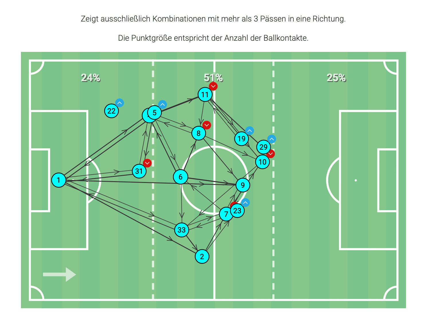 Zum Vergleich die Passgrafik der 96er: Da zirkuliert der Ball bereits in Titz-Manier. Dreh- und Angelpunkt ist Leopold (8).