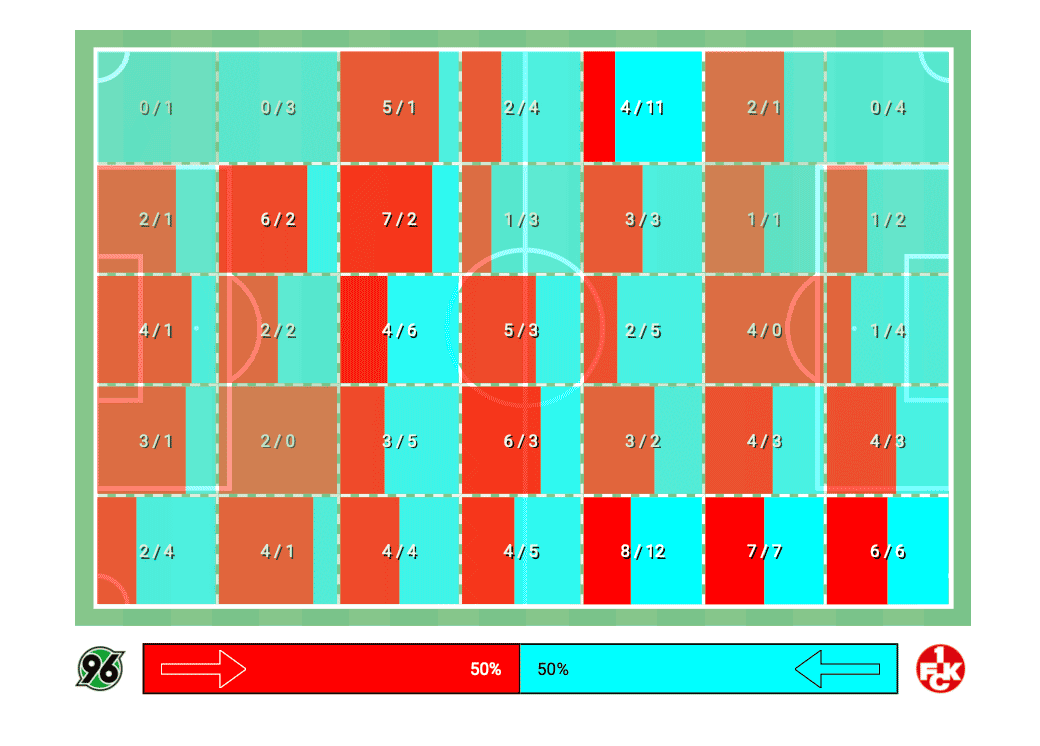 Zu guter letzt die Topographie zu den geführten Duellen. Die Zweikampfbilanz wird zwar mit 50:50 angegeben, aber bei genauerem Hinsehen zeigt sich: In den Zonen um die Strafräume entschieden die Gastgeber mehr Duelle für sich. Auch das sind so "Kleinigkeiten", die Sieg oder Niederlage erklären können.