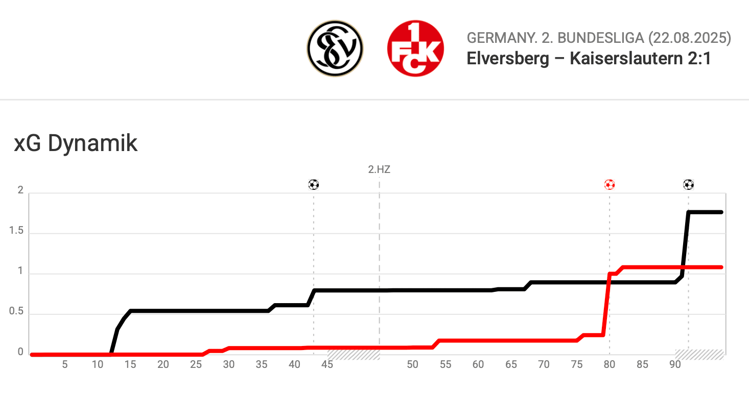 Zu den Grafiken. Die xG-Timeline sähe ohne den Ausreißer, den der Elfmeter verursacht hat, für den FCK noch erbärmlicher aus.