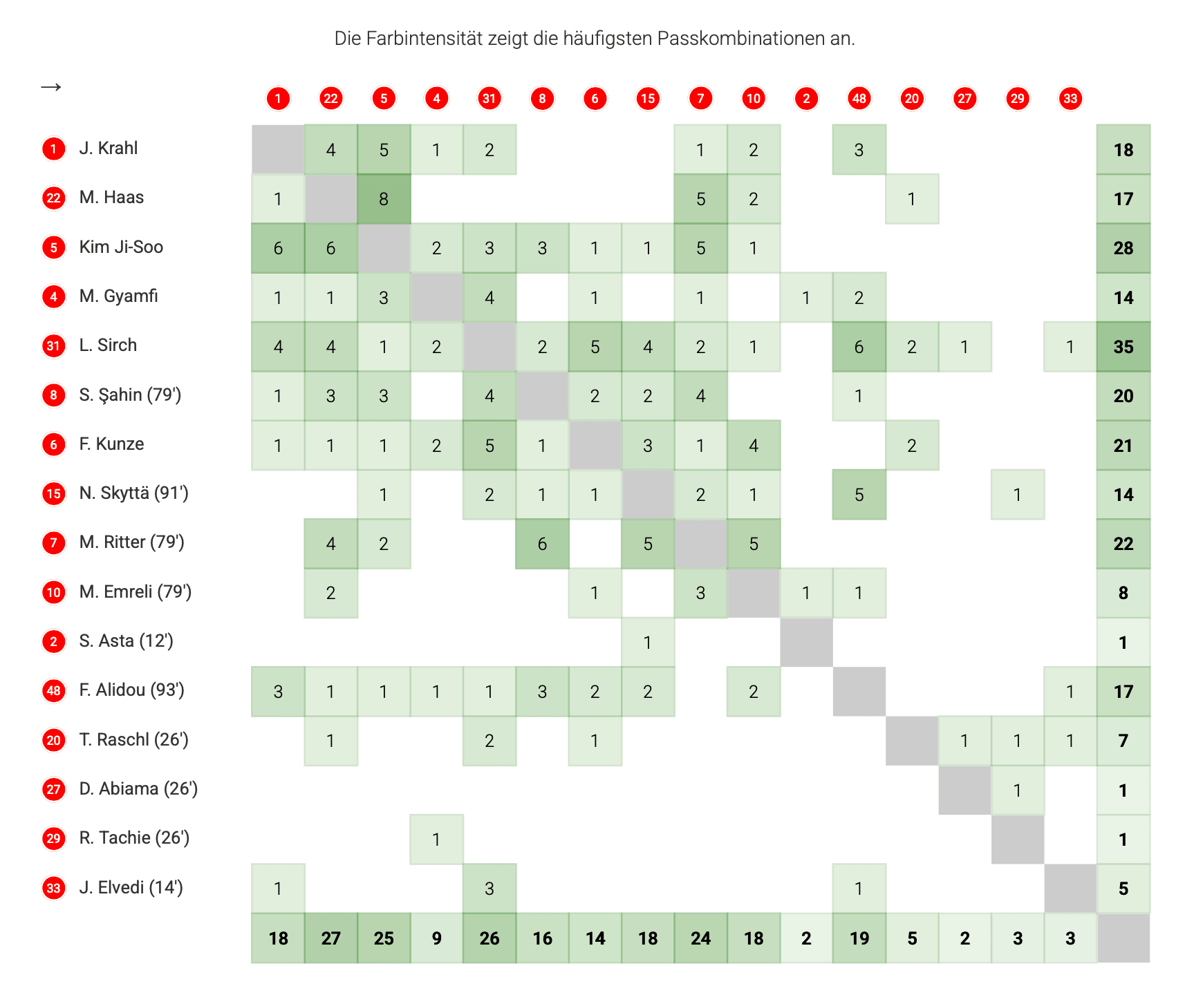 Zur Verfeinerung hier noch die Übersicht über die Lautrer Passkombinationen. Hier ist, wie oben beschrieben, zu sehen, dass Ritter viel besser im Spiel war als Skyttä. Da ist noch viel Luft nach oben.