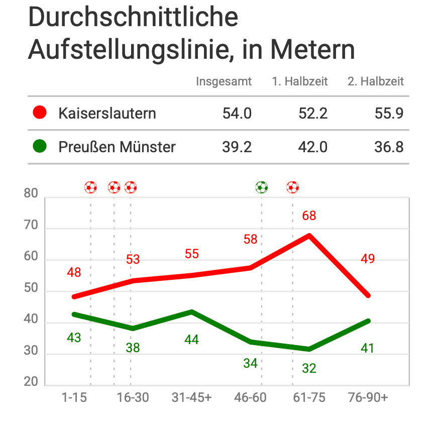 Es folgte eine hochspannende Phase, in der die Preußen die stärkeren Szenen hatten. In der die Pfälzer auch nicht mehr souverän wirkten, aber nicht so die Kontrolle verloren, wie es in der Vergangenheit öfter zu sehen war. Vor allen Dingen ließen sie nicht hintenrein drängen, blieben hoch positioniert. Dies belegt diese "Wyscout"-Visualisierung, die einen Überblick darüber gibt, wie sich Aufstellungslinien im Lauf der Partie verschoben.