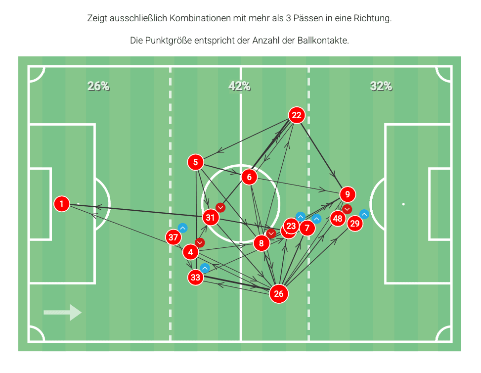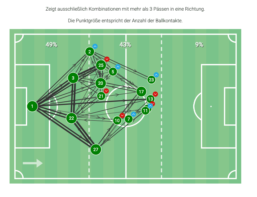 Die Positions- und Passgrafik des FCK: Viele dünne Linien diesmal, da zeigen sich die lediglich 39 Prozent Ballbesitz. Beeindruckend zu sehen, was für eine wichtige Schaltstation Paul Joly (Nr. 26) bereits geworden ist.