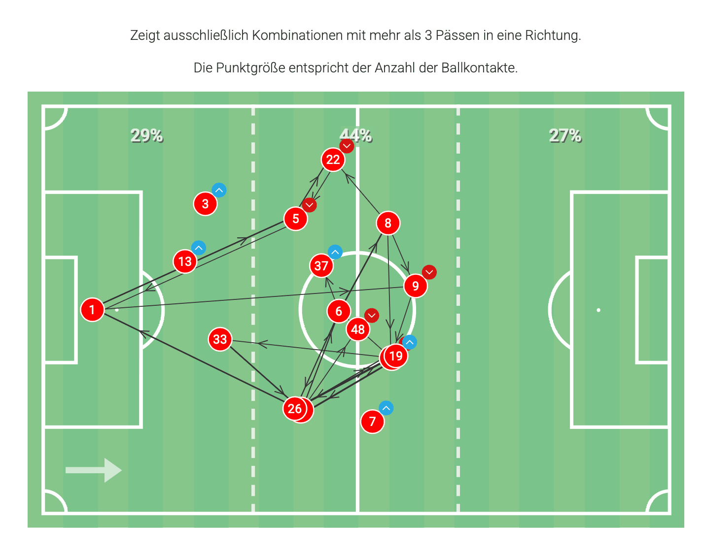 Die Passmap des KSC: Wesentlich passintensiver als die der Lautrer. Kein Wunder bei einem Ballbesitzverhältnis von 63 : 37. Erstaunlich: Eichner wechselte nur ein einziges Mal, dafür aber sehr offensiv. Für Beifus (4) kam Laghrissi (44).
