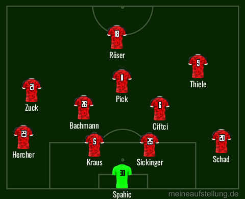 Spahic - Schad, Kraus, Hainault, Scholz - Bachmann, Ciftci, Zuck - Röser, Pick, Kühlwetter // Ersatzbank: Raab, Hercher, Jensen, Sickinger, Morabet, Starke, Thiele