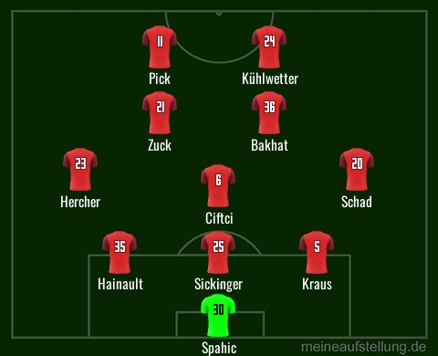 1. FC Kaiserslautern: Spahic - Schad, Kraus (Scholz), Hainault, Hercher - Bachmann, Sickinger (Ciftci) - Morabet, Pick, Zuck - Röser