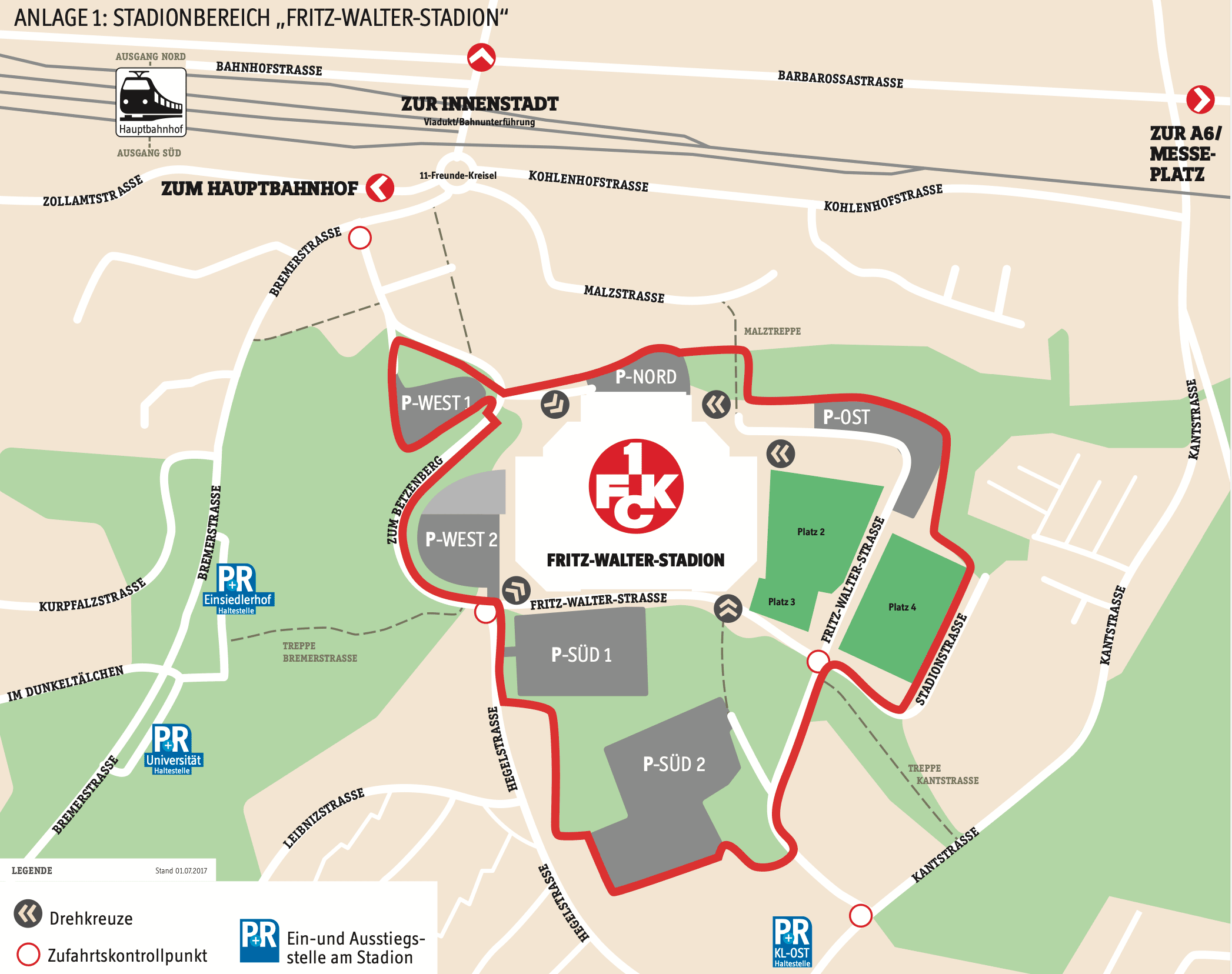 - An Heimspieltagen des FCK gilt ab 1 Stunde vor Stadionöffnung ein generelles Durchfahrtsverbot für jegliche Fahrzeuge in der Fritz-Walter-Straße sowie auf dem Stadiongelände. Das Abstellen von Fahrzeugen auf nicht dafür vorgesehenen Flächen ist verboten.